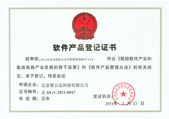 軟件產(chǎn)品登記證書——智云達(dá)多功能食品安全檢測系統(tǒng)軟件V1.0