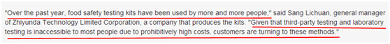 隨著中國(guó)食品安全事件的頻繁發(fā)生,越來越多的消費(fèi)者通過購(gòu)買食品安全快速檢測(cè)產(chǎn)品進(jìn)行自我保護(hù),這些產(chǎn)品可以檢測(cè)出食物中是否存在有害毒素、病原體和食品污染物。雖然專家們警告說這些快檢產(chǎn)品不能保證結(jié)果的絕對(duì)準(zhǔn)確,但仍有很多消費(fèi)者爭(zhēng)相購(gòu)買。