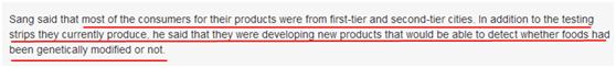 “在過去的一年里,食品安全快速檢測(cè)產(chǎn)品已經(jīng)被越來越多的人使用”,桑總介紹說,“大多數(shù)人因?yàn)闊o法支付第三方檢測(cè)平臺(tái)和專業(yè)實(shí)驗(yàn)室的高額費(fèi)用,轉(zhuǎn)而使用此類方法。目前使用這些快檢產(chǎn)品的消費(fèi)者大多來自一線和二線城市,我們一直不斷研發(fā)新產(chǎn)品,目前正在研發(fā)能夠檢測(cè)轉(zhuǎn)基因的產(chǎn)品。”