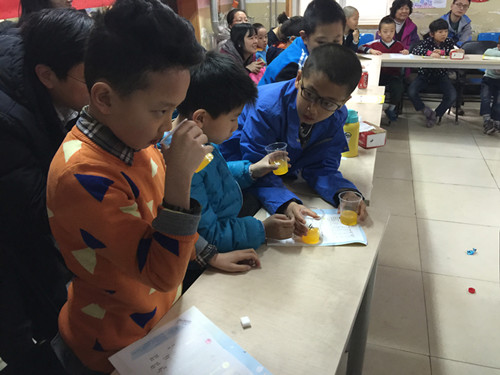 老師將事先調配好的果汁和從市場購買的果汁讓家長和小朋友們用感官來鑒別,猜錯的還真不少。