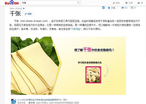 北京智云達科技有限公司作為百度百科和百度文庫的權(quán)威合作機構(gòu),在2015年上半年,公司利用自身食品安全方面的知識資源,為百度文庫提供關(guān)于食品以及營養(yǎng)的各類文章810余篇,為百度百科提供權(quán)威編輯詞條101個,并在千張、豆皮、餃子等食品詞條中嵌入食品安全隱患flash 53個,點擊即可了解相關(guān)食品中存在的食安隱患及對人體的危害。