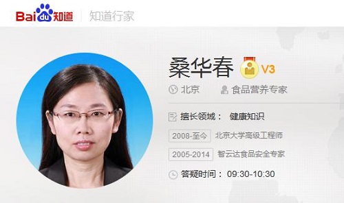 同時,北京智云達科技有限公司董事長——桑華春老師從2013年起一直在百度知道上為有食安疑惑的人解答食品安全的相關(guān)問題,共幫助140余萬人,優(yōu)質(zhì)回答數(shù)1900余條,目前是食品營養(yǎng)方面的知道行家。