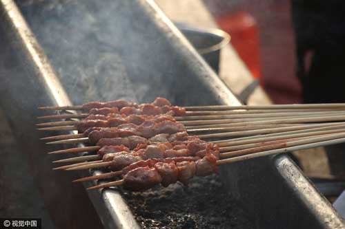 2017年1月31日,山東濱州,一燒烤攤主在春節廟會上銷售現烤現賣的鱷魚肉。廟會上,各類烤肉串、羊肉串已經不鮮見,但烤鱷魚肉不少趕廟會的人還是第一次見,許多市民爭相嘗鮮。為了吸引顧客,攤主擺了張著大嘴的整條鱷魚當招牌。