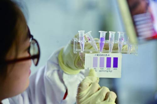 比對色卡,3號樣品二氧化硫含量在100mg/kg-200mg/kg之間