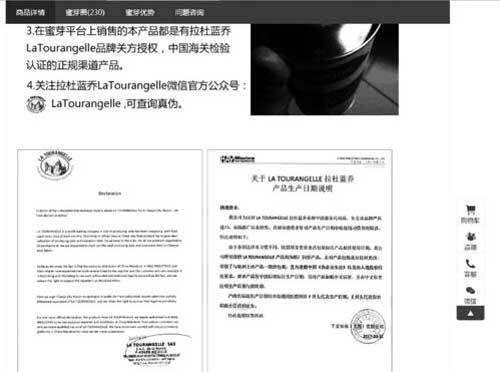 記者看到蜜芽網(wǎng)分別公布了廠家的英文版說明和代理商的中文版說明。千麥實(shí)業(yè)(上海)有限公司提供的產(chǎn)品日期說明顯示:由于各國(guó)法律及習(xí)慣不同,歐盟國(guó)家要求食品包裝標(biāo)注產(chǎn)品最佳使用日期,該公司所引進(jìn)的拉杜藍(lán)喬產(chǎn)品均為原廠同步產(chǎn)品,未對(duì)包裝進(jìn)行任何更改,保留了與歐洲上市產(chǎn)品一致的包裝,且為遵循中國(guó)《食品安全法》以及出入境檢驗(yàn)檢疫要求,要求產(chǎn)商按中國(guó)標(biāo)準(zhǔn)標(biāo)注生產(chǎn)日期,另對(duì)產(chǎn)品加貼中文標(biāo)簽,并在中文標(biāo)簽注明生產(chǎn)日期與保質(zhì)期。產(chǎn)商在標(biāo)注生產(chǎn)日期時(shí)亦按通用慣例以P開頭代表生產(chǎn)日期,E 開頭代表保質(zhì)期截止日以示區(qū)分。特此說明以答所惑。