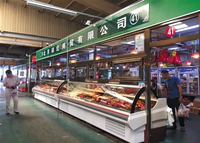 昨日上午,位于大洋路市場熟食區41號的北京瑞紅商貿有限公司仍在正常營業。調查顯示,4月以來該公司多次從黑作坊購入熟食。新京報記者 李強 攝