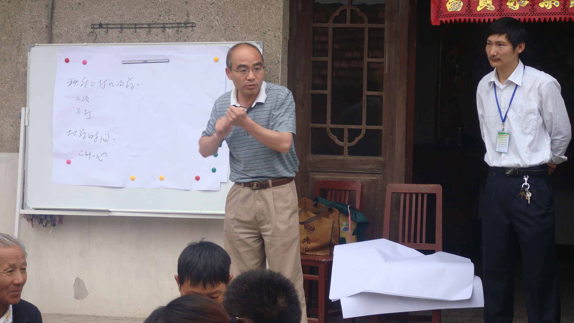 培訓課堂設在農家大院,首先由學員代表回顧了上堂課的學習內容和體會,根據課程安排,學員分成四個小組,在各組組長的帶領下,來到旱育秧田的現場進行田間觀察,開展討論并形成小組意見。課堂上,各組代表根據自己看到的旱育秧秧苗情況,積極發言闡明自己的觀點。對于不同的觀點,學員們討論激烈。課堂氣氛熱烈而融洽。在辯論中逐漸形成了旱育秧床后期管理措施并由輔導員作總結。