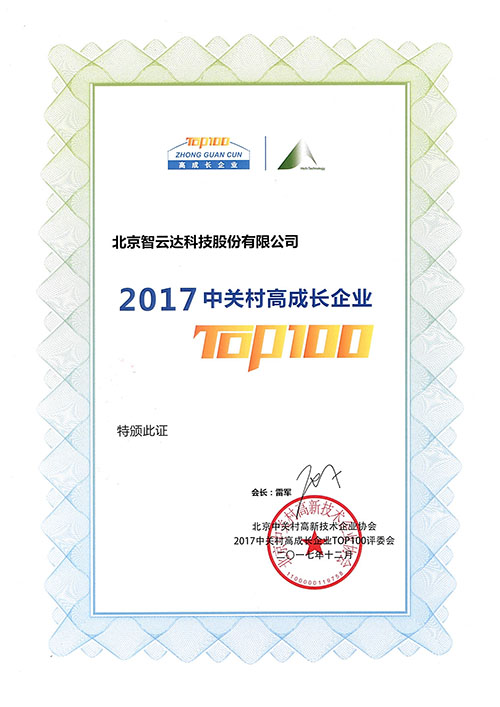 在北京市科委、中關村管委會、海淀園管委會的指導與支持下,由北京中關村高新技術企業協會主辦“2017中關村高成長企業T0P100”評選活動,北京智云達科技股份有限公司(后簡稱:智云達)順利通過評審,成為2017中關村高成長企業TOP100評選上榜企業。