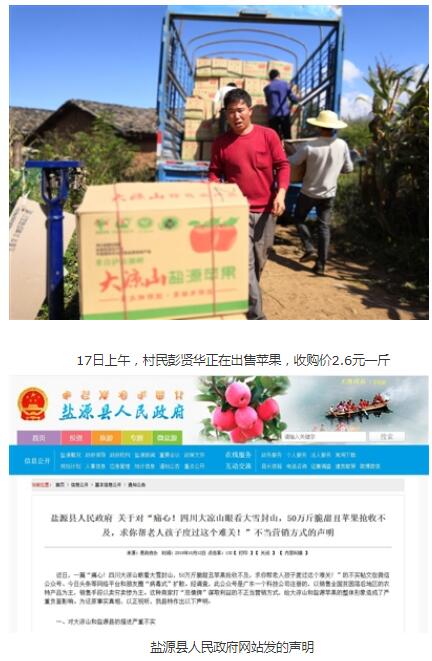 這篇名為《痛心!四川大涼山眼看大雪封山,50萬斤脆甜丑蘋果搶收不及,求你幫老人孩子渡過這個難關!》的帖文,配發了數十張照片,多數都是老人、小孩的照片,文字描述得十分悲慘,將鹽源蘋果描述為“丑蘋果”。內容稱,因為天災頻繁,交通不便,蘋果難以運出山里進行售賣,收購價被壓到兩三毛錢一斤。“鄉親們也無奈,他們條件不足,越早摘越能賣個好價錢,只能讓收購商低價收走。我們不忍心跟他們說,山外的原生態蘋果往往都能賣出十幾元一斤。”