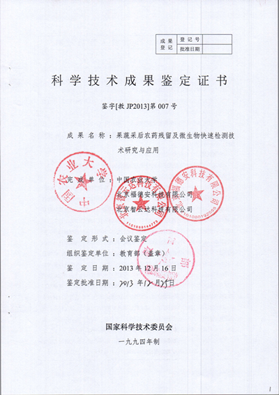 最終,智云達(dá)參與完成的“果蔬采后農(nóng)藥殘留及微生物快速檢測技術(shù)研究與應(yīng)用”、 “精煉食用油摻偽快速檢測技術(shù)研究與應(yīng)用項(xiàng)目”順利通過教育部科技成果鑒定,教育部已于12月25日向完成單位及各位完成者頒發(fā)了科學(xué)技術(shù)成果鑒定證書,這是對(duì)智云達(dá)研發(fā)能力的極大認(rèn)可,智云達(dá)將加倍努力研發(fā)更多、更好的產(chǎn)品以保障我國食品安全,使智云達(dá)真正成為行業(yè)研發(fā)的領(lǐng)導(dǎo)者和行業(yè)第一品牌。