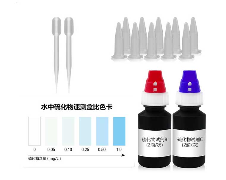 1. 取1mL水樣于1.5mL離心管中,滴加2滴硫化物試劑B,再滴加2滴硫化物試劑C,蓋蓋搖勻,靜置10分鐘后,開蓋從上至下觀察顏色,和色卡比對,可以得出樣品中的硫化物含量。
