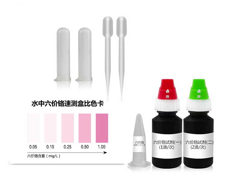 鉻(Cr)在其化合物中常見的價態(tài)有三價(Cr3+)和六價(Cr6+)兩種。六價鉻為吞入性毒物/吸入性極毒物,皮膚接觸可能導(dǎo)致過敏;更可能造成遺傳性基因缺陷,吸入可能致癌,對環(huán)境有持久危險性。其毒性比三價鉻高100 倍,且更易被人體吸收,在體內(nèi)蓄積,對人體造成危害。本速測盒適用于生活飲用水及其水源水中六價鉻的快速檢測。
