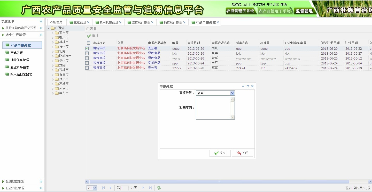 監(jiān)管部門負(fù)責(zé)處理三品產(chǎn)品的認(rèn)證審核。審批結(jié)果包括通過和駁回,如此申報駁回需填寫駁回原因。如圖2-1所示