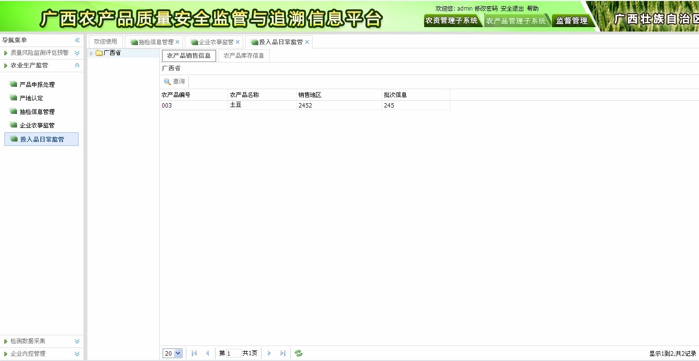 ? 抽檢信息管理:行業(yè)例行監(jiān)測抽檢,專項風(fēng)險監(jiān)測,所含信息包括產(chǎn)地、生產(chǎn)者、品種、檢測結(jié)果、處理情況、檢測員等信息。如圖2-3所示